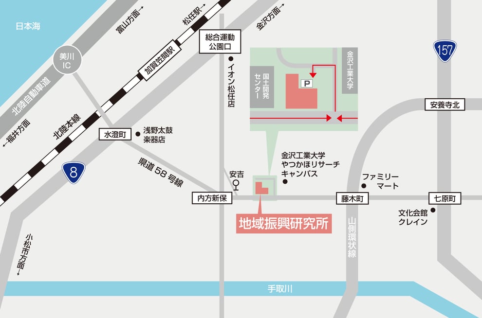 地域振興研究所は、白山市八束穂(やつかほ)の「石川ソフトリサーチパーク」内にあります。 「金沢工業大学 やつかほリサーチキャンパス」向い、「国土開発センター」隣です。